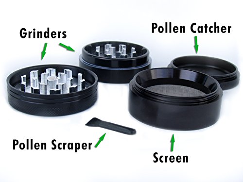 Keif Katcher - Best Large 4 Piece Black Aluminium Herb Grinder with Pollen Screen, Scraper, and Kief Catcher - 2.5 Inches