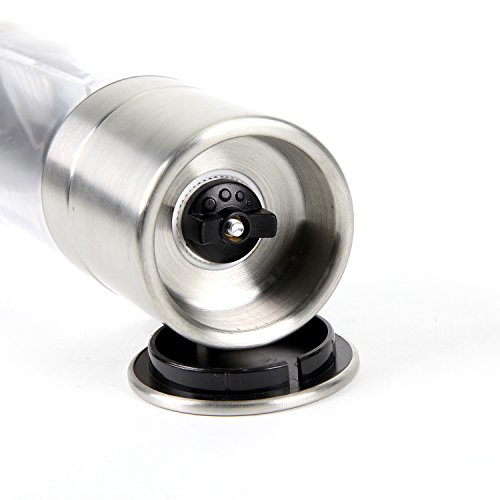 - Easily add black peppercorn, salt and other spices to this sleek stainless steel grinder. Easily adjust the grinding setting by simply twisting the knob on the ends of the mill. Additional features include a base for precise seasoning, an acrylic viewing chamber to easily identify the contents.