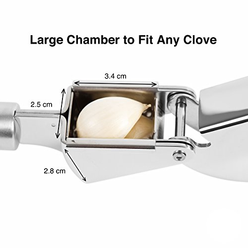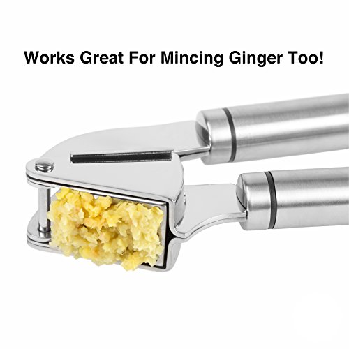 - PRESS UNPEELED GARLIC AND GINGER. Thanks to the heavy duty construction and ergonomic design, you can easily mince both unpeeled garlic cloves and peeled root ginger. What's more, there is next to no waste: garlic comes out, peel stays in.
