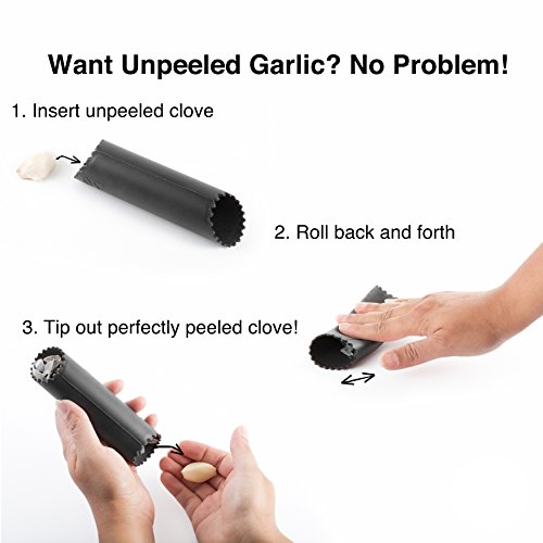 - WANT PEELED CLOVES FOR SLICING? NO PROBLEM! Crushed garlic is delicious and versatile, but sometimes you want to slice it up! Being the only press on Amazon to come with a garlic peeler, we've got you covered.