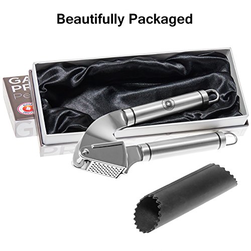 - SOLID STAINLESS STEEL. Since the garlic press is made from solid, high quality stainless steel, and the peeler tube from tough FDA approved silicone, these cooking gadgets will last as long as you need them.