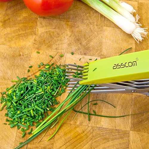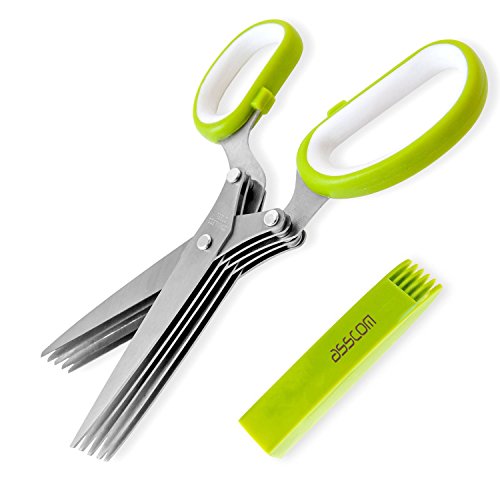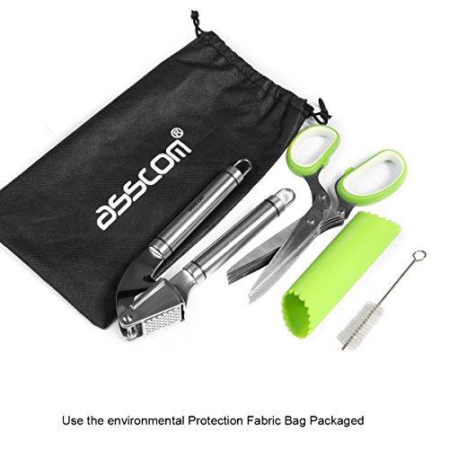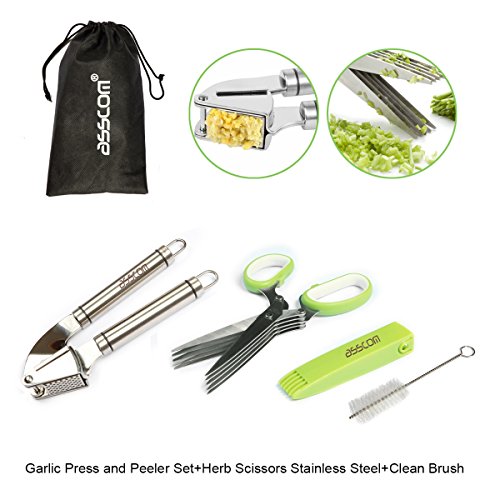 - BRAND:Asscom,We put the 3-IN-1 for Garlic Press and Peeler Set+ Herb Scissors Stainless Steel+Clean Brush, Garlic Press slicer Stainless Steel Mincer and Silicone Tube Roller, Herb Scissors Multipurpose Kitchen Shear with 5 Blades and Cover with Cleaning Comb.It is very convenience for you to use and clean them.
