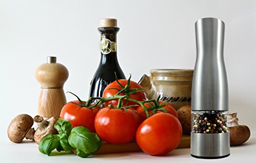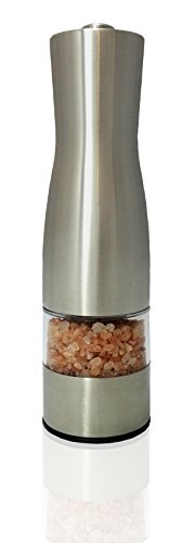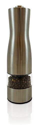 Spice Grinders and Mills Battery Powered Automatic Electric Pepper Mill, Salt Mill, Elegant Brushed Stainless Steel with Powerful Ceramic Grinding Motor and Adjustable Grinding Coarseness, Push Button Action Classy, Stainless Steel Grinder is Perfect for Kitchen Use and Looks Gorgeous for the Dining Area Table This pretty pepper or salt mill supplies an elegant way to spice up your lifestyle. With battery powered ceramic grinding fine-tuned to suit your coarseness demands, all it takes is a push of a button to get the taste you need to have on your up coming dish. The see-by means of window ensures you will never run out of pepper or salt at an inopportune moment, and the handy base cap keeps loose pepper from leaving a mess on your table or countertop. The ceramic grinding mechanism is resilient ample to final a lifetime, and the six AAA batteries (not included) will give you enough power to release all the flavor out of each peppercorn. Do you really like the taste of freshly ground pepper? Does cranking the grinder make your hands and wrists hurt like crazy? Now you don\'t have to crank pepper any longer. With the touch of a button, this elegant, stainless-steel pepper mill does all the work for you. It is adjustable, by turning a dial, so you can decide on from fine to coarse pepper, depending on what meal you\'re preparing and what grind satisfies your personal PPP ~ (Individual Pepper Preference)! The classy stainless steel and acrylic mill is see-by way of, so you can fill with fancy multi-colored peppercorns, and can see when to refill the grinder too! Guests will have enjoyable with the push-button ease and battery-operated action of your mill, and your dinner table could get a little lively with all the entertaining! This pepper mill is a fantastic gift concept for buddies and family members. Any pepper lover will use their new mill each day! For those you really like who are seniors, or who struggle with arthritis, fibromyalgia, carpal tunnel syndrome, or other problems the place hands are not as robust as they utilized to be, this pepper mill can supply a welcome relief to hands and wrists...AND it truly is so significantly Entertaining! $19.95 http://ecx.images-amazon.com/images/I/41ii9Ugw42L._SL160_.jpg