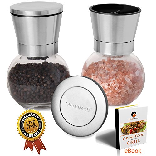 Premium Salt and Pepper Grinder Set, Stainless Steel with Glass Globe Base, Adjustable Ceramic Rotor, Salt Mill and Pepper Mill for Himalayan Salt, Peppercorn and Spices, BONUS eBook – By MegaMetz.