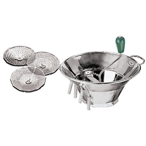 The Paderno World Cuisine 5 quart tin food mill is used to strain or purée fruits and vegetables. By placing cooked fruits or vegetables in the mill and turning the crank, the semi-circular blade oversweeps, compresses and scrapes food. The bar that straddles the container applies constant pressure against the cutting plate and crushes the food, while retaining seeds, skin, and fibers. The food mill comes with three cutting plates allowing for a variety of textures. These interchangeable cutting plates have perorations of either 1/16”, 3/32” or 5/32” (1.5 mm, 2.5 mm or 4 mm). This food mill’s output is approximately 3 lbs. per minute and fits on any 7” or larger receptacle.