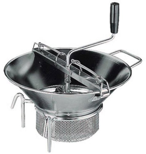 The Paderno World Cuisine 8 quart stainless steel food mill is used to strain or purée fruits and vegetables. By placing cooked fruits or vegetables in the mill and turning the crank, the semi-circular blade oversweeps, compresses and scrapes the food. The bar that straddles the container applies constant pressure against the cutting plate and crushes the food, while retaining seeds, skins and fibers. The basket sieve cutting plate allows for larger amounts of food to be milled at one time. This food mill’s output is approximately 10 lbs. per minute and fits on any 10¼” to 24” receptacle. The food mills comes witha 1/8 inch sieve.
