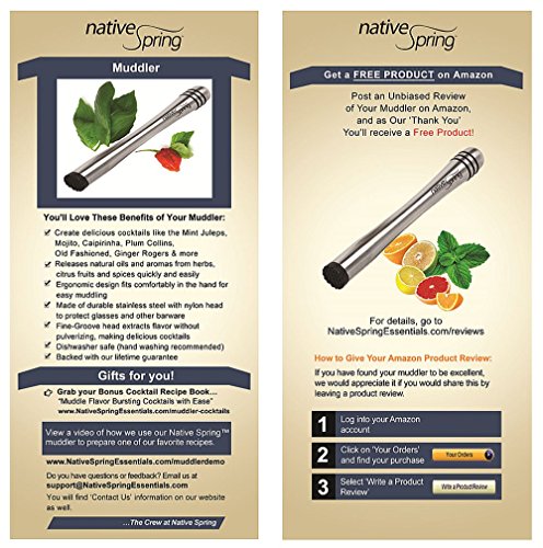 Your search for the excellent muddler (and the perfect at-house cocktail) is ultimately above.When you obtain the Native Spring Premium Muddler these days, here is what you ought to do...When that sweet brown box from Amazon arrives at your door, tear it open the first likelihood you get. Get out your new muddler and value the trendy but effortless-to-open packaging. Open the box to reveal your new muddler. Admire its sleek, contemporary layout.Okay, enough admiring!Grab your muddler and the components for your favourite muddled cocktail (maybe a mojito?) and head for your kitchen. Take pleasure in the feel of the muddler in your hand as it very easily crushes the herbs and fruits. Enjoy the tempting, heady aromas that fill the air as you prepare your masterpiece.Chill out into your favourite chair and savor your first sip of the absolute finest cocktail you have ever produced. Oh, yeah... now that is perfection! Envision your following get together - certain to characteristic your new favourite muddled beverage. Anticipate the compliments. Get pleasure from an additional sip...What separates the Native Spring Premium Muddler from the competitors? It really is basic, actually. It starts with the premium stainless steel body and nylon head, ergonomically created for effectiveness, comfort and elegance. Gentle adequate for tender herbs however effective ample to quickly pulverize fruit and spices. Sheer muddling perfection.It truly is due to the fact of this that we can make a ensure not like any other. We phone it our a hundred% No-Headache Lifetime Assure. If at any time you are not entirely in adore with your muddler, just contact us for a replacement or a refund.So purchase now with peace of mind. Helps make a wonderful gift - it confident beats the heck out of a tie or a scarf! And you\'ll enjoy the recipes and professional bartender muddling tips incorporated in the free of charge downloadable Muddle Flavor-Bursting Cocktails With Ease pdf e-book.