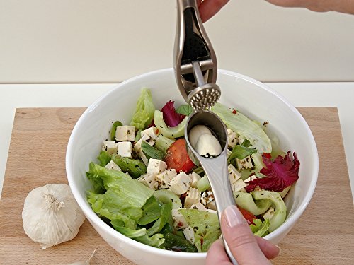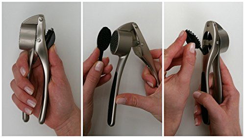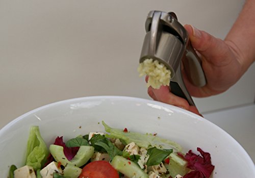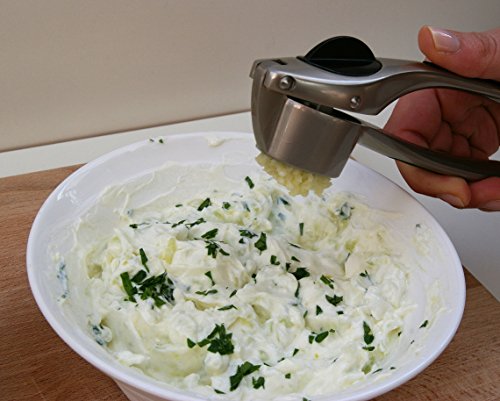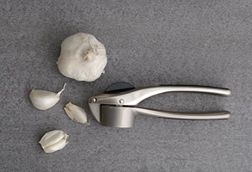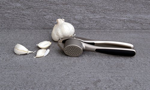 - HIGH QUALITY, VERY STRONG GARLIC PRESS: This professional garlic presser is crafted to meet our highest quality standards and is made with Zinc Alloy for maximum durability. It is as strong as stainless steel, but it has a beautiful mat finish look. It won't break or rust.