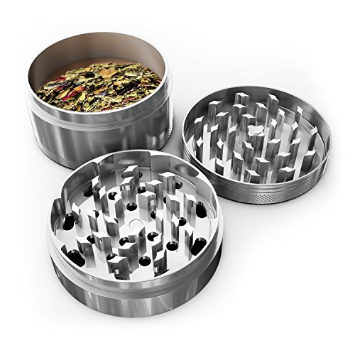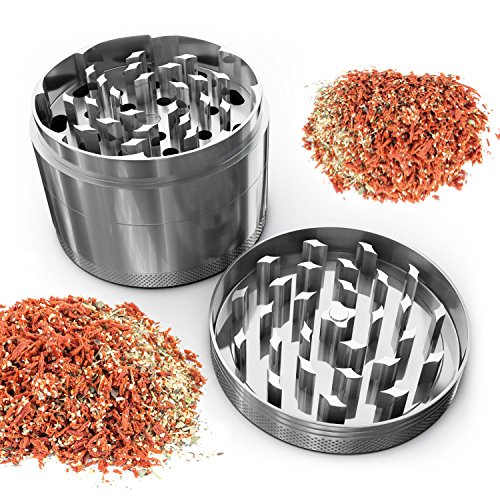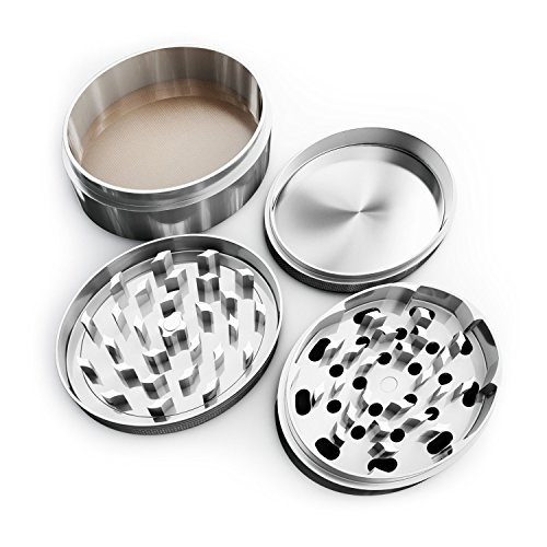 • TOP QUALITY & DESIGN: Built from heavy-duty aircraft-grade aluminum on high-precision computerized CNC machines for the utmost quality, sharpest teeth and longest durability. The optimum 2.5-inch size ensures you can grind a lot of herbs in one go. 50 diamond-cut razor sharp grinding teeth ensure you get a perfect crush every time. The super fine pollen mesh filters out pollen, and the deep pollen catch ensures you waste none of your herb every time. The powerful built-in neodymium magnets keeps the lid secure, the herbs fresh and the odors sealed inside. Textures on the side of the lid give the best slide-free grip when grinding your herbs. Powerful but smooth and quiet grinding and milling operation each and every time.