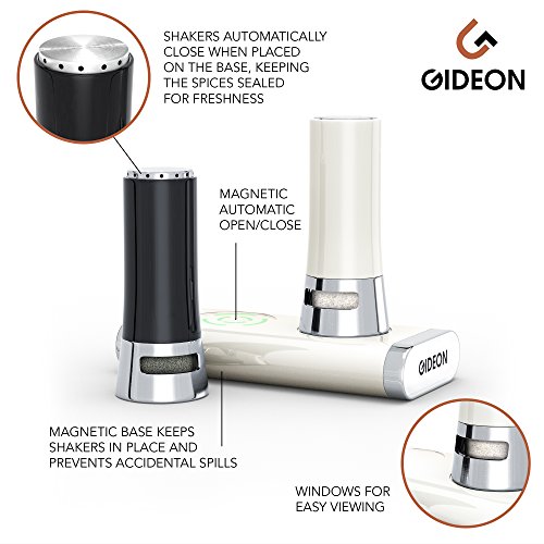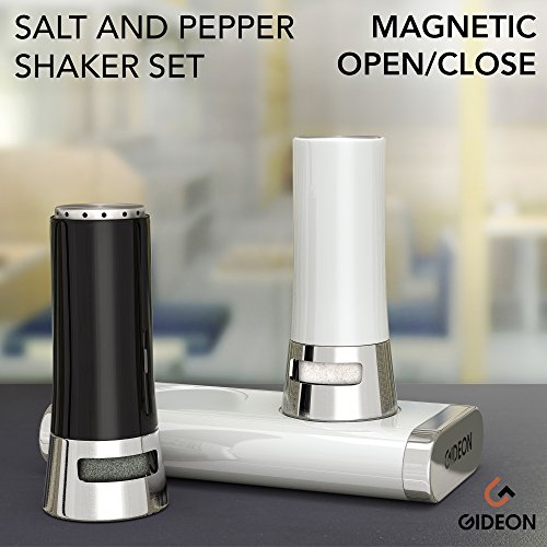 GideonTM Magnetic Automatic Open/Close Salt and Pepper Shaker Set with Base The Gideon Salt & Pepper Shaker Set is an innovative remedy for maintaining spices and salt sealed while not in use. When putting the shakers onto the base, the magnetic force within the base pulls down the opening of the shakers, creating the shakers to be tightly sealed, thus trying to keep the spices really fresh. When lifting the shaker off the base, the magnetic force gets released and the shakers will instantly open and be prepared to use. Size: two.5 Oz Shakers (four.five\" H x two\" W) Package involves: 2 shakers 1 magnetic base