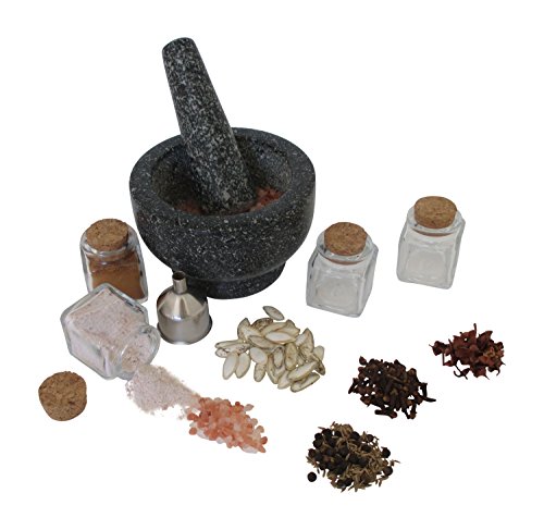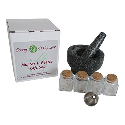 - Includes gorgeous, natural black granite mortar & pestle, 4 small spice jars with cork, and 1 small funnel.