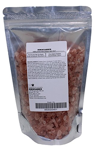 Salt Indusclassic Kosher Pure Natural Unprocessed Himalayan Edible Pink Cooking Coarse Grain Salt (1 lbs Coarse Grain 3~6mm) INDUSCLASSIC® Coarse Grain Himalayan Crystal Salt is Premium Meals Grade and Pink in colour. Our gourmet salt is a hundred% normal and pure. It is hand-mined salt found naturally deep inside the pristine Himalayan Mountains. The large mineral crystals selection in shade from sheer white to varying shades of pink to deep reds which signifies a useful amount of 84 trace aspects & iron. All of our Himalayan salt goods are \"Gourmet Meals Grade\" and the very highest high quality Himalayan salt offered. Himalayan Dark Pink, Light Pink, and White salt was formed from ancient sea salt deposits in the lengthy Range Himalayan Mountain, and it was crystallized with 84 minerals more than 200 million many years ago in the course of the formation of our planet. Himalayan Rock Salt is the purest salt to be found on earth because Ancient sea beds had been covered by volcanic lava, guarding the salt from pollution. $5.99 http://ecx.images-amazon.com/images/I/51wlqPaYDsL._SL160_.jpg