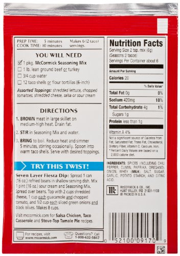 McCormick Taco Seasoning Mix is a zesty blend of genuine Mexican seasonings, which includes onions & peppers, that\'s specified to flip ordinary foods into a fiesta of taste. Taco Seasoning has a hearty taste that\'s not as well spicy but warm enough to complement a range of meats. For South-of-the-Border taste appeal, McCormick Taco Seasoning Mix is the seasoning of choice. Is made up of no extra MSG!