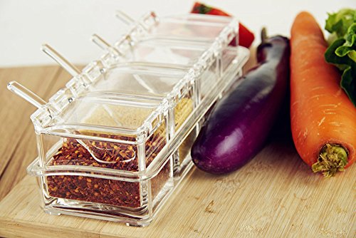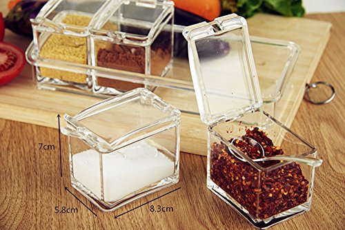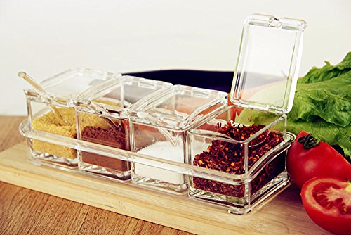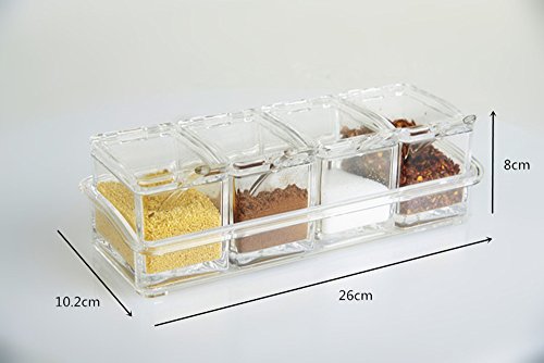 Clear Seasoning Rack Spice Pots - 4 Piece Acrylic Seasoning Box - 4 Cruet With Cover and 4 Spoon Do not be concerned that the salt or pepper dirty your kitchen counter. Never exhausted the surplus condiments nowhere to please. Our seasoning boxes can assist you to remedy the difficulty. Efficiency: one.Made from substantial good quality acrylic materials and BPA free of charge, eco-friendly and keep health two.four every individual pot packaged, simple to remove three.Each and every pot has person cover, avert the condiments from all ash or other dirty factors 4.Anti-corrosive four Totally free modest spoon (2ml) attached for each pot, just to use. 5.Stylish look developed, make your kitchen much more lovely 6.Easy to clean and store Specification: Every box size: 8.three*five.8*7cm/three.27*two.28*2.76in Complete set size: ten.24*4.02*3.15in/26*10.two*8cm Weight: 664g Warranty and Providers: thirty day money back and 1 12 months ensure, we will supply very best solutions for you. Choose ME.FAN,decide on be concerned cost-free.