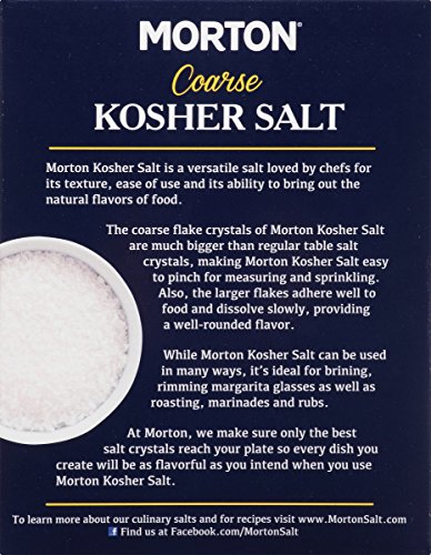 Morton Kosher Salt is a versatile salt loved by chefs for its texture, ease of use and its capability to deliver out the all-natural flavors of food. The coarse flake crystals of Morton Kosher Salt are significantly larger than normal table salt crystals, producing Morton Kosher Salt easy to pinch for measuring and sprinkling. Also, the greater flakes adhere well to food and dissolve gradually, offering a well-rounded taste. Whilst Morton Kosher Salt can be utilized in a lot of ways, it\'s ideal for brining, rimming margarita glasses as well as roasting, marinades and rubs. At Morton, we make sure only the greatest salt crystals reach your plate so every dish you create will be as flavorful as you intend when you use Morton Kosher Salt.