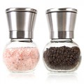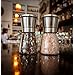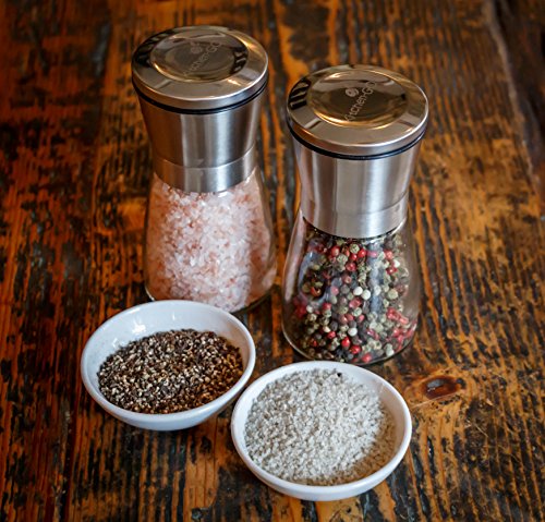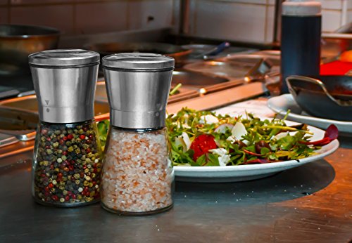 - PREMIUM QUALITY - Our salt and pepper mill set have MODERN AND ELEGANT design. The brushed stainless steel grinders with high quality glass body and non-corrosive ceramic blades are perfect addition to any kitchen.