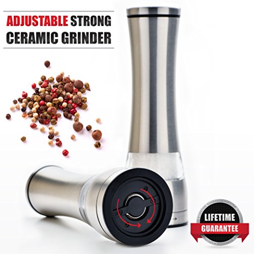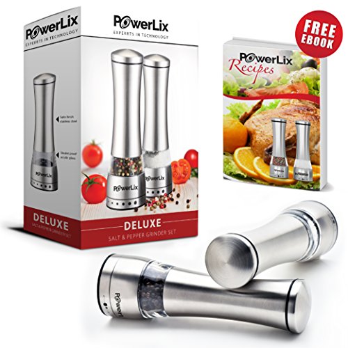 PowerLix Deluxe Stainless Steel Salt And Pepper Grinder Set- Set Of 2 Mill Shakers With Adjustable Ceramic Grinder- Brushed Stainless Steel & Glass Construction- eBook Include
