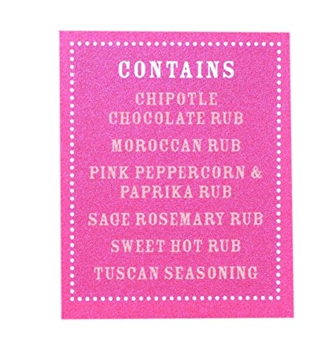 - Sampler contains: Chipotle Chocolate Rub, Pink peppercorn and paprika rub, Sweet hot rub, Tuscan spice rub, Sage and rosemary rub, and Moroccan rub.