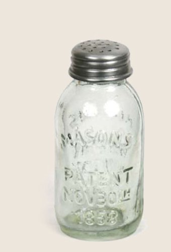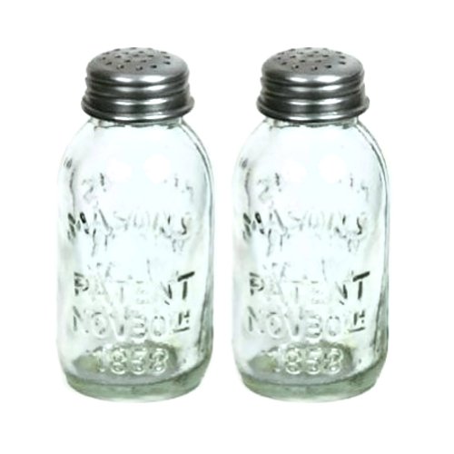 Set of 2 glass mason jar salt and peppers shakers with tin tops. Each and every shaker measures 1½\" diameter and 3¾\" tall. Bring a rustic charm to the table with these common shakers. Please wash ahead of use. Present boxed for straightforward wrapping!