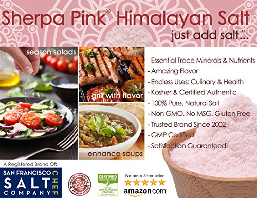 - TASTES GREAT -- Our 100% pure Himalayan pink salt tastes great and is certified Kosher. Sherpa Pink Himalayan salt is great for seasoning meats, grilled vegetables, a variety of salads (such as pasta, egg or potato salads), soups & stews and is also a flavorful salt to use for baking.