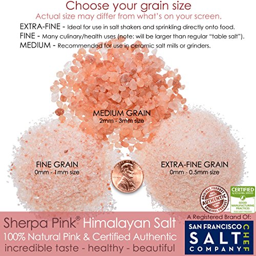 - AVAILABLE IN 3 GRAIN SIZES -- Sherpa Himalayan pink salt is available in Extra-Fine, Fine and Medium Grain Sizes. If you're looking for a very small size grain try our best selling Extra-Fine size. If you want a larger grain to grind yourself try our Medium size. PLEASE SEE GRAIN COMPARISON IMAGE (AT LEFT) TO CHOOSE THE GRAIN THAT BEST SUITS YOUR NEEDS.