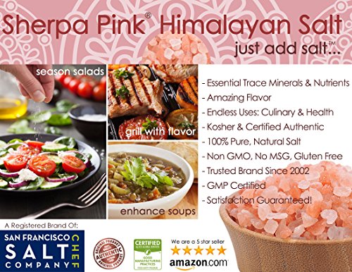- TASTES GREAT -- Our 100% pure Himalayan pink salt tastes great and is certified Kosher. Sherpa Pink Himalayan salt is great for seasoning meats, grilled vegetables, a variety of salads (such as pasta, egg or potato salads), soups & stews and is also a flavorful salt to use for baking.