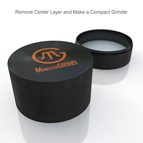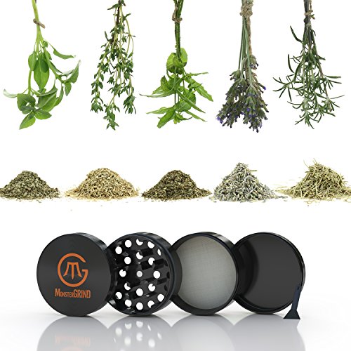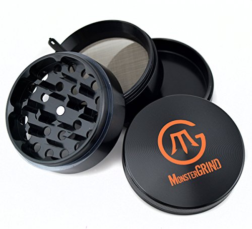 - NOT YOUR AVERAGE GRINDER: MonsterGRIND's Ultra Premium 4 Piece Crusher is Crafted from Aerospace Grade Aluminium Rod using CNC machining technology. This guarantees a Perfect Fit, Razor Edged Grinding Teeth & Life long durability. Powerful Neodymium Magnets keeps lid in place, avoids spillage and retains the fresh odour. Comes with a high quality 100 micron mesh for separating pollen.