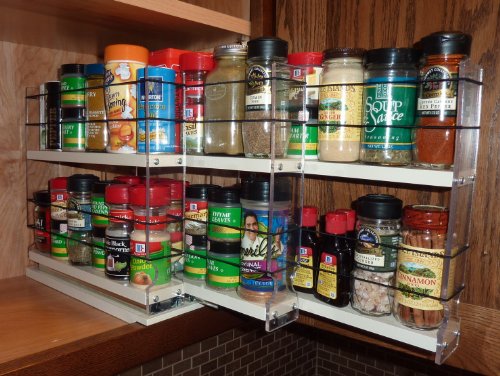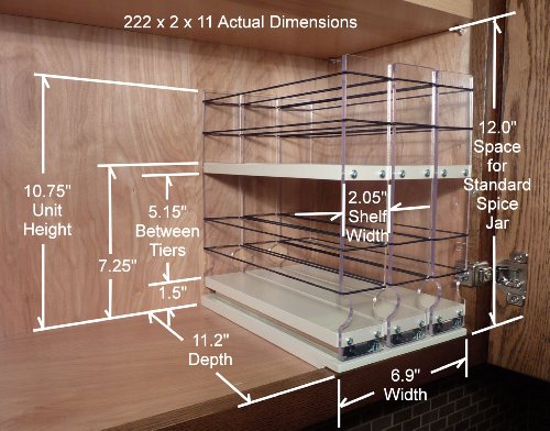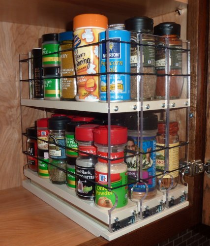 The 222 x 2 x eleven Spice Rack offers large capability in a tiny area with full accessibility to the back row of your cabinet. This is our most well-known marketing product and it accommodates the two normal and half-sized sized spice containers (i.e. Penzeys, McCormicks, Spice Islands, and so forth.), no need to have to re-package deal. The drawer unit arrives pre-assembled with the required mounting screws. Vertical Spice merchandise are the special and greatest kitchen cabinet storage resolution. Versatile bands and clear panels give simple and total entry to your stored flavors. Steel ball-bearing slides give smooth, sturdy and lengthy lifestyle to the drawers. The Tough Coated finish is oven baked paint for simple cleansing and long life. Units can be placed in new, outdated and renovated cabinets and just a Phillips screwdriver is necessary for very effortless mounting. We have a total line of several unit sizes and configurations for you to mix and match to meet your custom organizational wants.