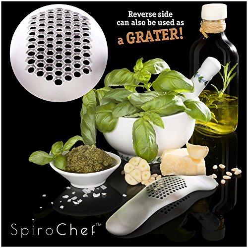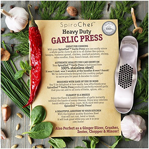 When Good quality and Ease Count, Absolutely nothing but SpiroChef (TM) Will Do! Right here are 5 Factors You are Going to Adore Your SpiroChef (TM) Garlic Press:one. It easily minces garlic (No much more sore palms or aching fingers)2. Big Press Region (Press excellent sized cloves)3. No far more stinky \"garlic hands\" (Simple to use and even less difficult to clean so you won\'t smell like garlic cloves all day)four. Hefty duty, good quality construction 5. Backed by a 100% LIFETIME Fulfillment Guarantee! (Order yours now since you practically Danger Absolutely nothing!) Use it in your kitchen to include loads of flavor to your preferred dishes! Once you\'ve noticed for oneself how handsome the SpiroChef Garlic Press appears, how simple it is to use, how quickly you can clean it, we\'re assured you are going to have LOADS More than five motives to enjoy it! Picture... you could be enjoying the robust flavor of minced garlic in all of your favorite dishes - spaghetti, lasagna, risotto, and so a lot far more! All you need to do is click the \"Add to Cart\" button at the top of this page! Rewards:1. Saves you income. Produced of unbreakable, heavy duty stainless steel from top to bottom2. Great when you are in a rush. Enables you to put together dishes more quickly - Just press and crush! Also Generates juicy garlic mince in seconds3. Simple to clean by hand!four. Avoids that GARLIC smell lingering on your fingers. Merely pop the peeled clove underneath5. No much more bland cooking!six. Impress your dinner visitors - Get the total flavor and aroma from each and every single clove7. Wonderful Present - A sound, fundamental tool for any kitchen8. Great Style - Fits comfortably in any size hands. Massive ergonomic handles offer leverage and tends to make pressing straightforward and efficient. It\'s simply the strongest, most robust, easiest-to-use garlic press you can get! Scroll to the best and Include to Cart with self-confidence!