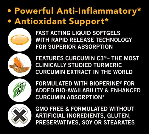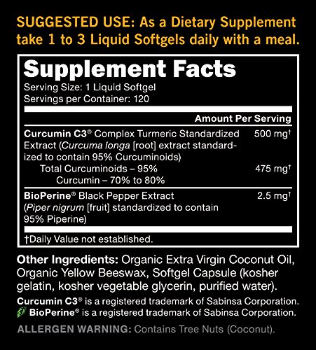 Turmeric Curcumin C3 Complex Liquid Softgels incorporate 500 milligrams of curcuminoids, an anti-inflammatory and antioxidant compound derived from curcumin, the yellow pigment in turmeric. Every single softgel is standardized to 95 percent curcuminoids with organic further-virgin coconut oil and BioPerine, which enhances bioavailability and absorption. These liquid softgels are manufactured without having preservatives or additives and are certified to be allergen free of charge. Turmeric curcumin. With bioperine. 95% curcuminoids. With further virgin coconut oil.