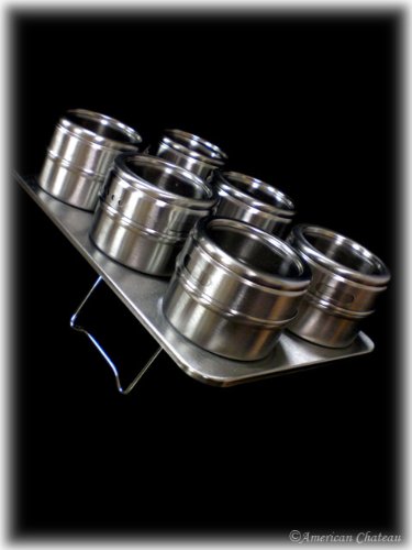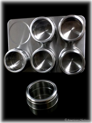 This countertop spice rack in stainless steel has 6 magnetic jars connected. Every single spice jar has a stainless steel entire body and has a glass best for identifying your spices. They also have adjustable holes on the side that make the jars double as shakers. Include a touch of present day to your kitchen with this spice rack. Approximate Dimensions: Length: 9\", Depth: five 1/two\", Width: 5\". Jars: Height: 1 three/4\", Diameter: 2\".