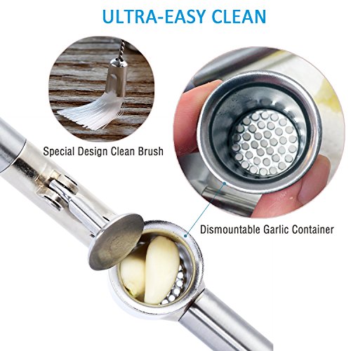 - BEAUTIFUL ERGONOMIC DESIGN; Makes a great addition to and compliments any kitchen d¨¦cor; Being the only press on Amazon to come with a GARLIC PEELER and CLEAN BRUSH, we've got you covered. Great gift for your favorite hostess or home chef