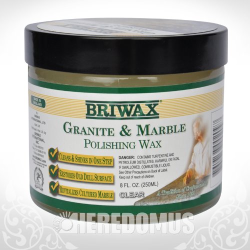 A specially prepared blend of natural waxes. Granite & Marble Wax will clean granite, marble, quarry tiles and terracotta, leaving a subtle, soft sheen. Please Note: When using natural waxes, water spots and water rings oft times occur when in contact with water. Care must be taken if the product is used on floors or steps, as a wax finish can be very slippery. Avoid placing loose rugs on such surfaces. DIRECTIONS: Apply with a brush, clean rag or #0000 steel wool. Allow wax to dry and buff to a soft sheen.