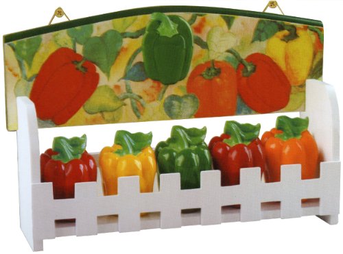 Bell Pepper, Chili Morron, 5 Piece Ceramic Kitchen Spice Jar Set with decorative wood wall or standing rack, matching accessories sold separately. Use to help keep your kitchen clean, beautiful and well organized. Also will make a great gift for a birthday, wedding, anniversary or Christmas. Well made piece is very nicely detailed with white picket fence to keep spice jars neatly aligned. Easy to clean, wipe with damp cloth. Overall dimensions: 12.5x8x2.5 Inches.
