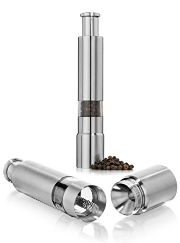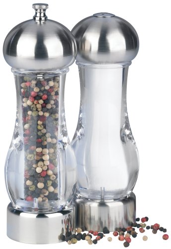 Trudeau is leading the way with its unique, stylish and enduring kitchen tools. They offer a modern design and the Trudeau quality assures years and years of dependable use. Trudeau’s mills exemplify their commitment to excellence. Pepper is an essential ingredient for most of our culinary creations. Nearly every kitchen is stocked with pepper. Pepper is ground to release the flavor. However, once ground, pepper has a storage life of three months. Keep your kitchen stocked with peppercorns and you’ll no longer need to worry whether or not your pepper is still fresh and flavorful; peppercorns can be stored indefinitely. Not only do mills cut peppercorns to release the rich flavor and aroma of the pepper, they also allow you to adjust for the perfect grind. Always ready to provide you with the optimal grind, Trudeau’s pepper mill and salt shaker set, comes filled with high-quality peppercorns and salt. The grinder is constructed of ceramic. Ceramic is more expensive and a higher quality than carbon steel so your grinder will stay sharp and provide superb output. And, it will never rust. Freshness in the twist of the mill. Stainless steel finish and acrylic. Gift boxed. 7-inch tall