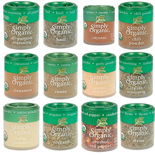 The Simply Organic Starter 12 Spice Gift Set includes one bottle each of: Organic All Purpose Seasoning, Organic Basil, Organic Cayenne Pepper, Organic Chili Powder, Organic Cinnamon, Organic Cumin, Organic Garlic Powder, Organic Italian Seasoning, Organic Onion Powder, Organic Oregano, Organic Paprika, Organic Thyme.